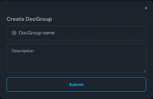 To create a new doc group, click on theCreate Doc Group button. You will be asked to provide a name for the doc group and a description. Once you provide the doc group information, click on the Create button. Your doc group will be created and you will be shown the new doc group in doc groups page.