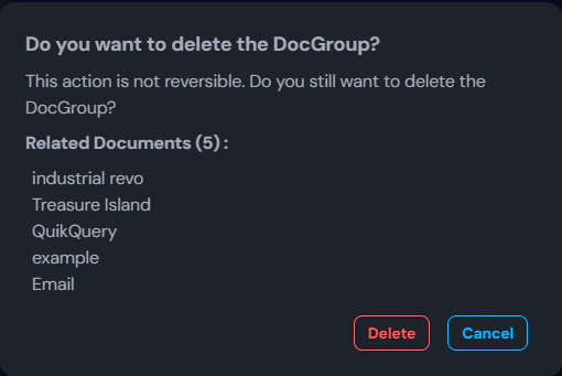 To delete a doc group, click on theDelete button. You will be asked to confirm the deletion. Once you confirm, the doc group will be deleted and you will no longer be able to access it (remember you lost all docs related on this do group).